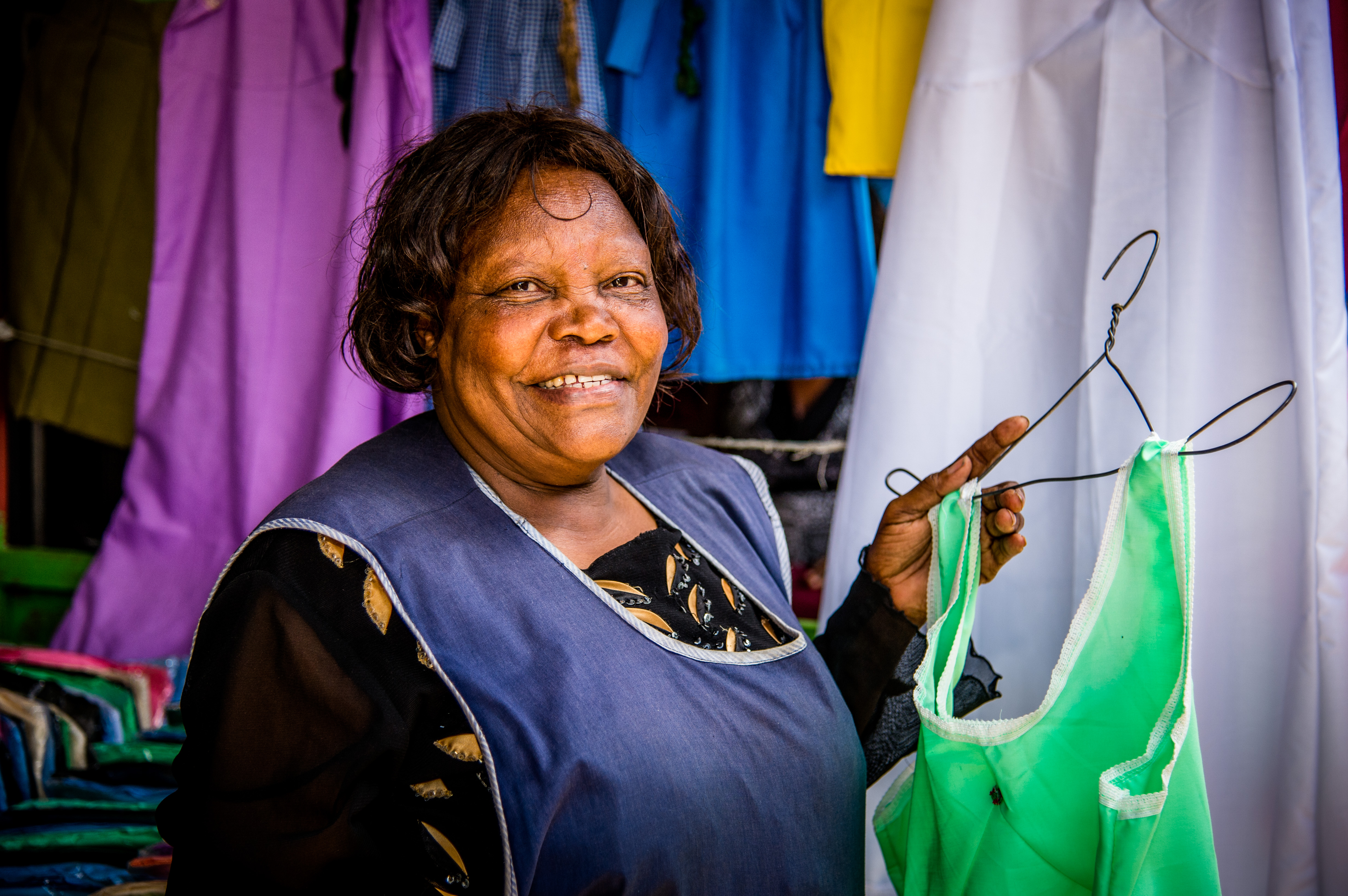 La Margaret Karicho (esquerra) és propietària de Maggie Fashions i clienta de Jitegemea Credit Scheme, que és finançada per Oikocredit. Ella ven vestits en un mercat de tèxtil a l'engròs a l'àrea d’Eastlands de Nairobi, Kenya.