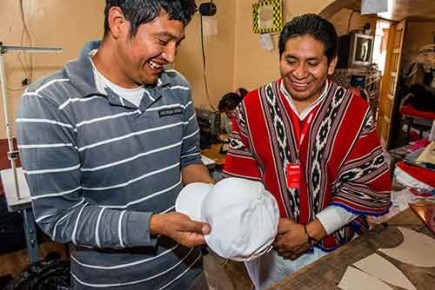 Cliente de microfinanzas Valdomero Vizueto, con el prestamista Marcelo Guamán, de la cooperativa de crédito COAC Fernando Daquilema, en Ecuador.