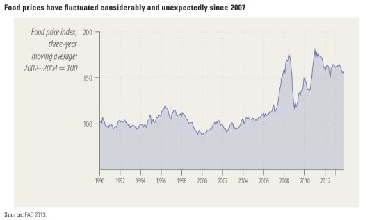 Pero los problemas de la banca convencional van mucho más allá. La especulación con alimentos o la inversión en industria armamentística son dos aspectos que también aparecen reflejados en este reciente informe de Naciones Unidas. De esta forma, en la página 48 encontramos la evolución del índice de precios de los alimentos, donde se aprecia una dramática subida a partir de 2007 de hasta más del 50% en un solo año, lo que ha provocado conflictos sociales y situaciones de hambre generalizada en varios países.