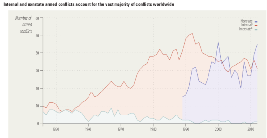 Al mismo tiempo, en la página 51 también se observa que el número de conflictos armados en el mundo ha aumentado de forma muy preocupante a partir de los años 70, debido a una industria bélica que sigue fabricando armas con un control demasiado bajo de la comercialización y destino de éstas, así como del mercado negro.