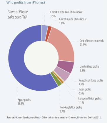 El comercio justo es otro sector que priorizamos desde Oikocredit, con ejemplos como la empresa Kuapa Kokoo, una empresa que vende chocolate en el Reino Unido y en Estados Unidos pero donde la mayor parte de la propiedad (45%) se encuentra en el país de origen, Ghana. En contraste con este ejemplo, encontramos una empresa multinacional como Apple, que aparece en un gráfico de la página 113 del informe. El gráfico refleja la desigualdad en la distribución del precio de venta de los iPhones, donde sólo un 5,7% recae en los trabajadores, mientras que el 58,5% se lo llevan los accionistas de la propia empresa.