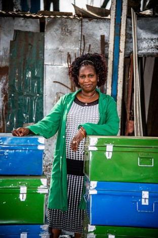 Teresia Kithira Miruri es viuda, tiene 54 años y cuatro hijos. Es una emprendedora keniana que se dedica a fabricar cajas escolares que, posteriormente, vende a los internados: compra las láminas planas de metal y contrata artesanos para que la ayuden a fabricar las cajas. Gracias a un préstamo de Sistemas de Crédito Jitegemea (JCS), una organización microfinanciera local, socia de Oikocredit, ha podido ampliar y hacer funcionar bien su negocio.