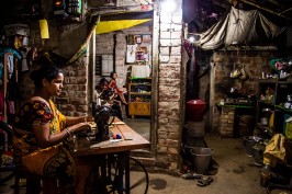 | La costurera Suparna Samanta (derecha) compró un paquete solar para el hogar de la empresa Punam Energy, apoyada por Oikocredit en India en 2014. Las bombillas iluminadas gracias a los paneles solares permiten a Suparna coser y a sus hijas estudiar también por la noche. Aunque la comunidad de Suparna se conectó recientemente a la red, su sistema solar le permite reducir las facturas y recibir un suministro constante de energía a pesar de los cortes de energía que afectan a la red. | ![]() |
